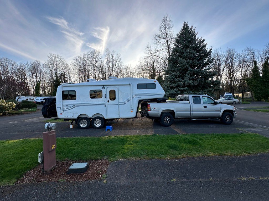 Just a side note on the tow vehicle for our 2023 Escape 5.0 fifth wheel…it is still our 2005 GMC Sierra 3500. For a couple of years now as I grew increasingly restless about the aging of the truck, I began to search out alternatives. Seeing the pricing on the new 1 ton vehicles, I began to research towing with a smaller 1/2 ton pickup. That downgrade appeared to be doable if I were careful about payload and towing capacity. I visited dealerships for GMC, Ford and Dodge, and could have been tempted to purchase except our cash flow at the time was a bit questionable. Also, our GMC began to have coolant leak issues, and I was concerned about trade-in value on it. Late in November, 2024, as my mechanic explored the sources of the leaks (both coolant, and oil) he came to the conclusion that both heads would have to be replaced on the truck for a possible cost of $12,000. Yikes! With a December 3 week trip to Japan in the plans, I left the truck in his hands. When we returned in January, the truck wasn’t ready, but by February, all work had been completed and total bills were about $13,000. Therefore, I concluded – NO NEW TRUCK! We are happy (so far) with that decision.