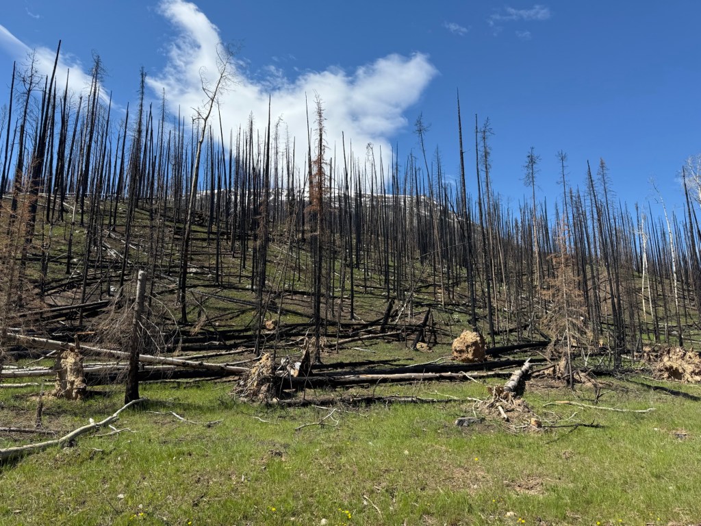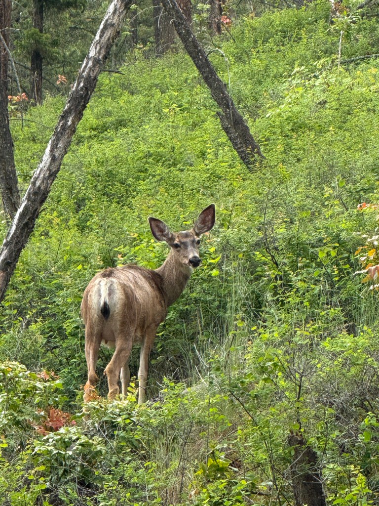 Later when the winds had abated a bit, we were having dinner at our picnic table as a troupe of 4 elk wandered by us. These are very large animals, and campers are warned to stay clear of them! (Reason #3 for scarcity of tents?)