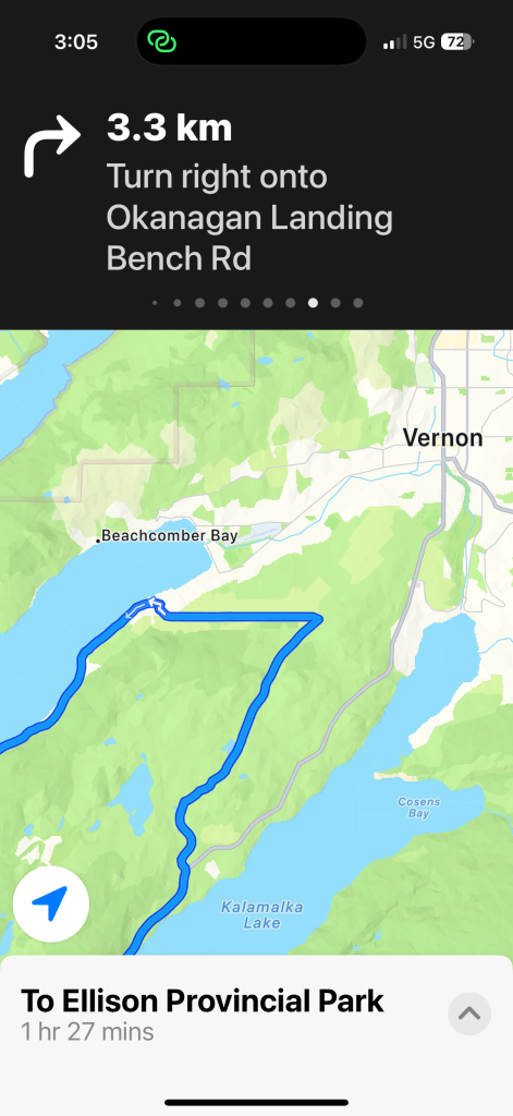 On Sunday we headed towards Vernon with a luncheon stop to visit cousins Norm and Shirley Caplette in Peachland. Later, as we approached Kalamalka Lake, the Map “app” (‘Roada’) had us turn left across the peninsula before arriving in Vernon, and after some twists and turns along a dodgy Bench Road, we were directed down “Okanagan Landing Bench Road”.