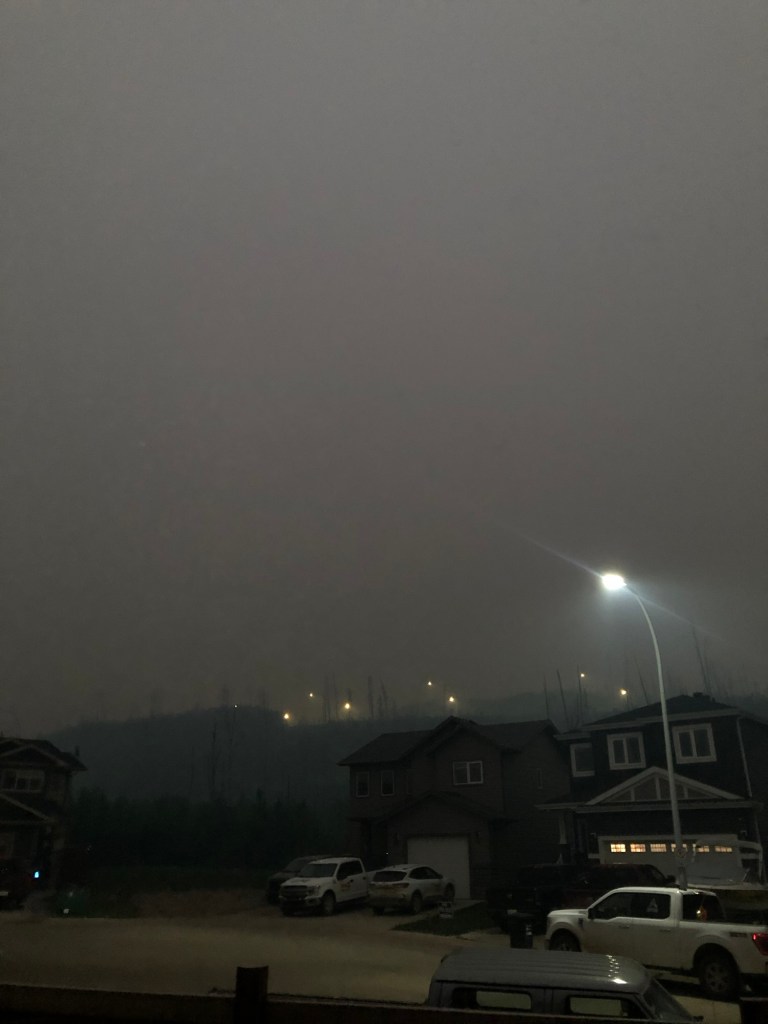 As we drove to Edmonton today on Hwy 16, we had 2 very loud and startling cell phone Fire alerts – both were evacuation orders, and both just as we neared the Hwy 16 intersection that linked to those towns – Robb, (to the south) and Peers (to the north). We smelled (and saw) a bit of smoke, but air is clear in Acheson where are are now, at a place ironically called “Glowing Embers R.V. Park”.
