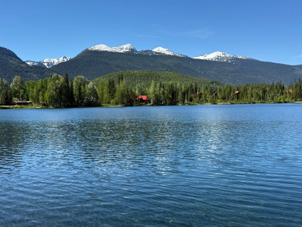 Blue River turned out to be a lovely little burg, and our host suggested that we try a walk around Eleanor Lake across the highway. We eventually found the trail around Eleanor Lake and enjoyed the shady walk around a beautiful little lake in the heat of the afternoon (about 29º). The area is central for heli-skiing, and the resort there (Mike Wiegele Heli-Skiing Lodge) is spectacular with large log accommodations and halls.
