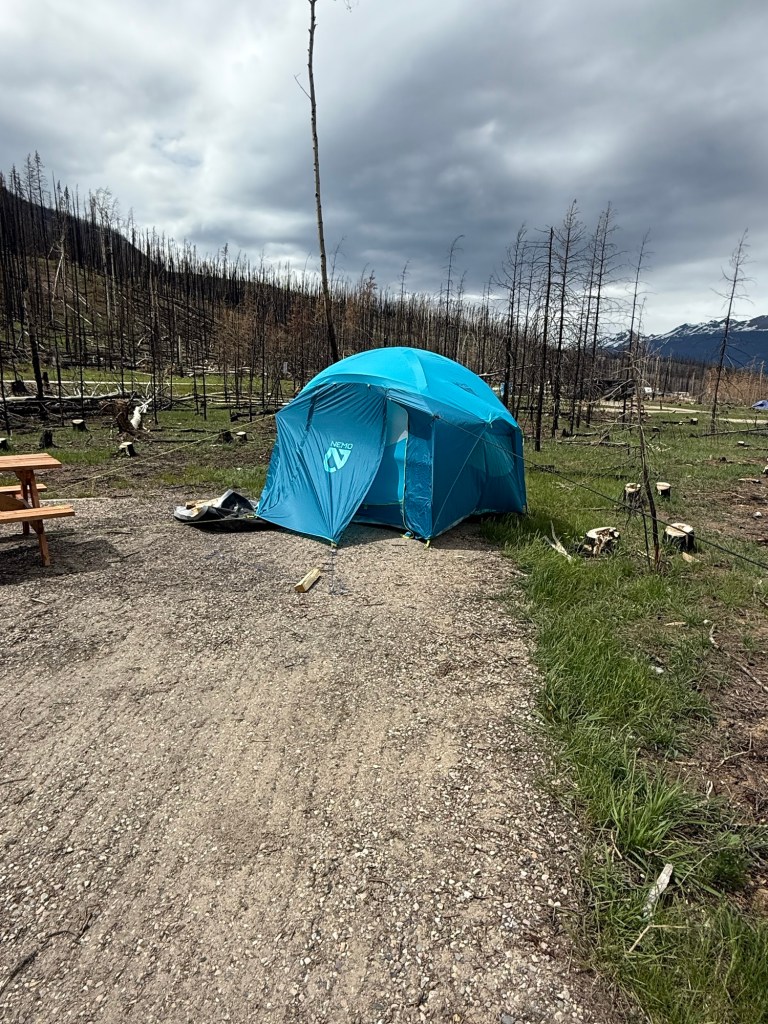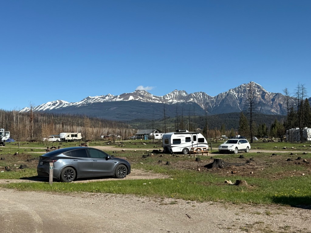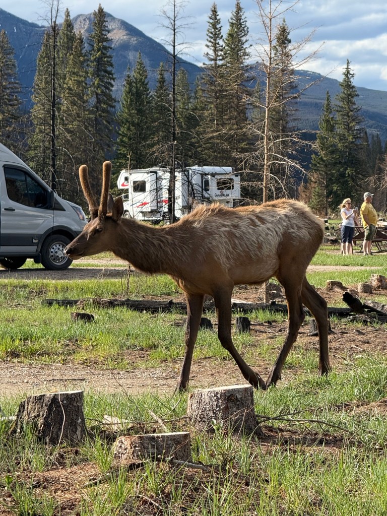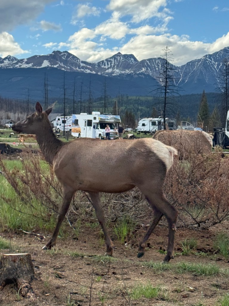 On Thursday, in pouring rain and much cooler temperatures we headed further northeast to Jasper National Park. The Whistler Campground is just out of Jasper townsite (3 km) and the vast majority of campers are in RVs. The whole area was burned out by a major forest fire last year and dead snags are visible as far as can be seen. Work is being done daily to clear these snags, but there are very few standing live trees in Whistler Campground. Tents seem to be a rarity, and we later found several possible reasons.