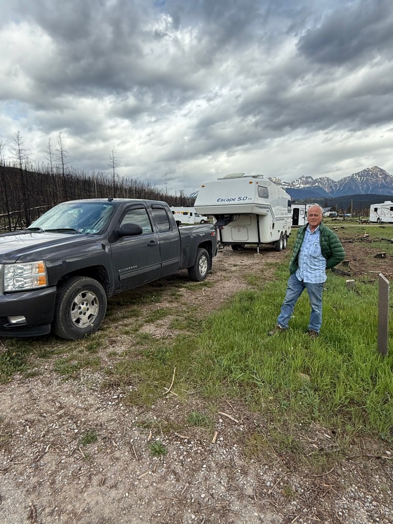 Our site for Monday was at Mt. Fernie Provincial Campground but first we stopped for a stroll around downtown Fernie. At the campground the various site loops were unmarked so we had to search a bit before we found our site – #33. Unfortunately, the placement of the table on the site, the angle of the entrance and my lack of developed skill on backing up made it impossible for me to get Truck House into the site. I finally gave up, and we found an unreserved site nearby.