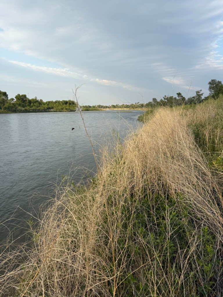 Other than periodic long trains passing on the other side of the river, the site was mostly peaceful, and there were lots of vacant sites. We hiked a few trails and then relaxed with our books. In the evening, a rather strong cell signal allowed us to watch a semi-final NBA game on my iPad – paired with my iPhone. (Aside: We have been able to watch most of the OKC-Minnesota games and the Indiana-NY Knicks games. Since I am cheering for Indiana, and for Oklahoma City, if OKC and Indiana meet in the final, I will have a difficult choice to make.)