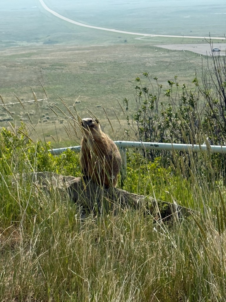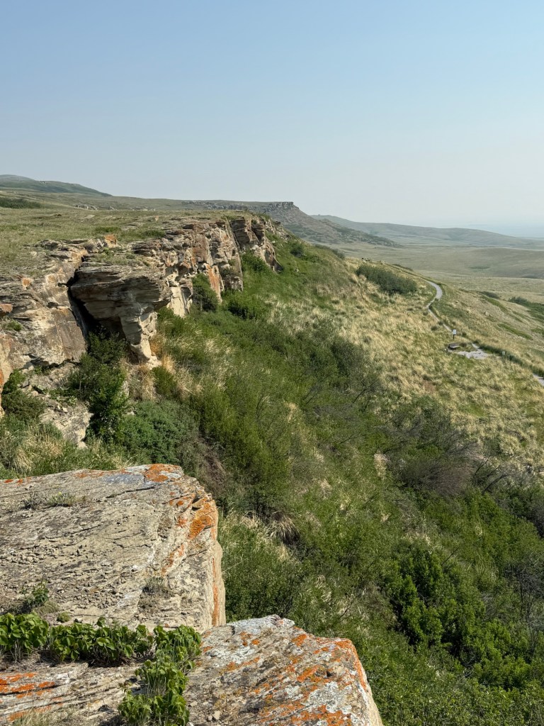 On Sunday we headed for the “Head-Smashed-in Buffalo Jump” – a World Heritage Site about 16 km away. We spent a number of hours there beginning with a long stair climb to the rim of the cliff. This climb is inside the exhibit building, and the option of elevators exists. At the top, on a beautiful sunny and warm (24º) day (albeit somewhat hazy from smoke) we strolled along the path at the top of the cliff admiring the views.