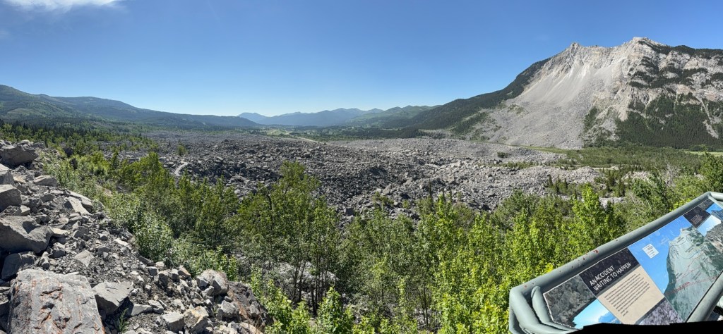 On Monday, June 9, we began our westward trip through the Crowsnest Pass. We stopped at the Frank Slide information centre for Sandy to see and learn about the massive Frank Slide which wiped out the coal mining town of Frank early in the 20th century.