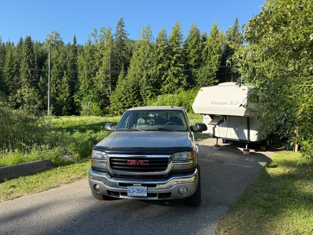 Our 2025 travels began in early April when we hooked up TruckHouse Jr. to the GMC Sierra and headed for Qualicum Beach – the “Brant Wood Carving and Art” show as sponsored by my woodworking group – Mid-Island Woodworkers’ Guild. We stayed overnight in the parking lot at the Rec Centre where we could be close at hand to help out as needed. It was a good opportunity to test out all systems for this year.
