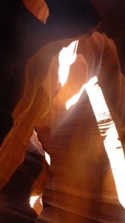 Then we headed up Hwy 98 to Antelope Canyon where we paid entry to the Navajo Park, and then bought tickets for the tour of Upper Antelope Canyon – along with many other folks! A fleet of pick-up trucks seating 10 in the back under a “ramada” frame carry the visitors up to a fissure in the canyon wall that goes for over a mile – open at the top so light comes in to provide incredible scenes of rock formations and sandstone carved by wind and water. Once again, photo opportunities are everywhere, and the guide, who seemed to know everything about everyones’ cameras, helpfully assisted with picture-taking throughout the winding fissure climb.