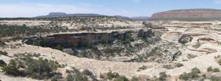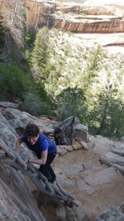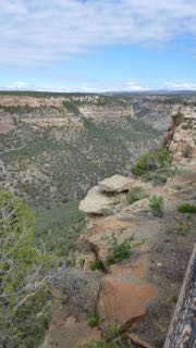 The road then follows a 10 mile loop with stops and trails for each of three natural bridges that are hidden below the mesa rim in the canyons below. The first trail down was a thriller with the well-built trail clinging to the sides of the cliffs. Near the last view point, the trail crawls along a drop-off under an overhang that abruptly ends. Sandy pointed to a bit of a trail leading around the corner of the cliff, and asked a returning hiker, “Where does that trail end?” His reply was, “In sudden death!” He was right…it lead to the edge of the cliff. We clung to the cliff face for our return back up the trail after taking pictures of the Bridge. We continued on around the loop making 3 more stops and shorter hikes to viewpoints and vistas!