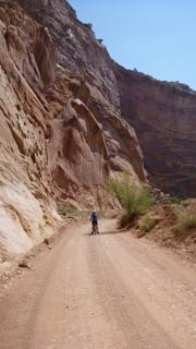 Shortly after, we came to a “Visitors’ Centre” in the historic community of Fruita, UT. We stopped, and decided to explore the Capital Reef National Park in behind the Visitors Centre and we followed a paved road that runs along the Waterfold geological formation. To our surprise, there was a truly beautiful RV Park in the shade under trees on the old Gifford farm – one of several in this historical Mormon community which grew fruit successfully. (We cannot find mention of this in any of our tour guides, or pamphlets!) It was too early in the day for us to take a site, but we carried on up the 10 mile road to the end of the pavement, and then rode our bikes down into the canyon beyond. What a stunning array of overhanging cliffs! Perhaps, this was one of the prettiest side trips we have taken on this journey.