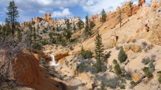 On the way out, we stopped in the old farmhouse to purchase a fresh cinnamon bun at the bakeshop, and then continued west through Escalante, and then Boulder, before climbing high (snow still around) over the pass (9600 ft. – with a spit of rain and some fat water near the top) that leads towards Bryce Canyon National Park. This road drops down again into another canyon. As the road climbed again towards Bryce Canyon City, we passed a pull-off to “Mossy Cave”. Naturally, we had to explore this trail. Most notable was a pretty little rushing creek with a waterfall. This creek bed had been dug by hand by Mormons in the last century who wanted to bring water into the valley below!
