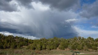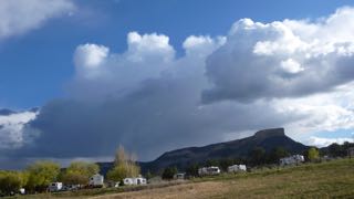 Sure enough, by the time we reached the Visitors Centre at the end of our Arches visit, we watched some lighting, and rain drops were starting to splatter our windshield. Back at Green River, it was raining steadily. We joined the Padghams in their trailer for appies, while the rain bucketed down outside, and later, during the night we listened to it drumming on our roof for most of the night.