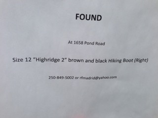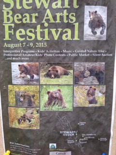 The Cassiar RV north of the turnoff to Highway 37 at Kitwanga is a very lovely spot. Everything is very green. They have had several weeks of rain, and one couple returning from Alaska told us that they had rain the whole trip. Under threatening skies, Sandy and I walked the trail down to the Kitwanga River to see a “fish count” in operation. The young native at the trap wouldn’t let us take pictures, but he was netting up some really impressive chinooks, pulling scales, and recording sizes. He gave us a very detailed description of everything that he was doing. We were quite impressed. No bears, no rain, however, two adjacent posters on the wall at the office caused me to ponder the dangers!