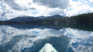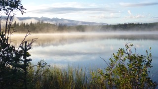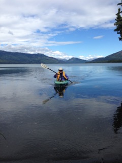 Early in the afternoon on Friday, we arrived at Boya Lake – a spectacularly beautiful lake with varying shades of turquoise. We were able to find a lovely spot with beach access, and got our kayaks quickly into the water for several hours of gorgeous paddling and fly-fishing. Two loons entertained us with repeated calls and a frantic bobbing up and down routine that I had never witnessed. No luck with fishing, but I saw a few distant jumps. A late afternoon shower caught me on the water, but I was headed in anyway, so didn’t quite get soaked. We ate an early dinner at campsite and then headed out again for a clear, absolutely calm, evening paddle and more unsuccessful fishing.