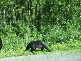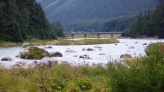 We arrived at Haines at 4:00-ish, and turned right to head away from the town and towards the State Recreation Site of Chilkoot Lake. The Chilkoot River flows into the salt-water estuary, and is quite wide with strong currents, turquoise waters, and many large boulders and fishers! All along the 3 km entrance-way to the camp ground folks were parked and walking, hoping to catch a glimpse of the evening approach of brown bears. At the mouth of the river at Chilkoot Lake fish were jumping and fishers were casting to try their luck. We watched as a few beautiful fish were caught, and then headed in to select our campsite. Later we walked back partway down the road and caught a glimpse of a brown bear sow and her two cubs down near the estuary end of the river. Crowds of folks lined a bridge above the bears to watch as they rambled for food along the bank.