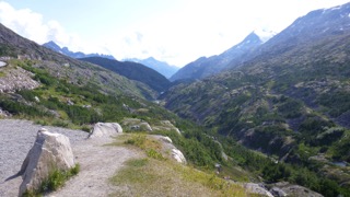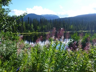 The highway out of Haines follows the Chilkat river estuary for a number of miles until the “Eagle Nest Park” where the road begins a long climb to a summit above the tree line. (Wrong time of year to see eagles, apparently.) Near the top of the climb, we were also very near to the base of the clouds, and suddenly we were in dense fog. This lasted only a short while until we dropped a bit into a fabulous valley that was the “Chilkat Trail” – an alternative to the Chilkoot Pass on the Skagway side. At 3 separate small lakes we saw pairs of beautiful swans – as advertised in brochures.