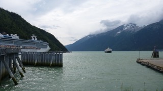 We made a run out to the Dyea Townsite this morning. I had hoped to catch a glimpse of the “Chilkoot Pass” but the road was potholed and washboarded – and narrow, the area is overgrown, and the only view of the Pass would happen when you do the hiking trail – apparently quite a long trail until you begin the climb. In 1897, this area was a grassy plain, not a tangled forest. Another stroll through Skagway with the Cruisers (Coral Princess), and then we headed for the ferry parking lot to await our crossing to Haines. We boarded the “Malaspina” at 2:30 in preparation for the 3:00 pm sailing.