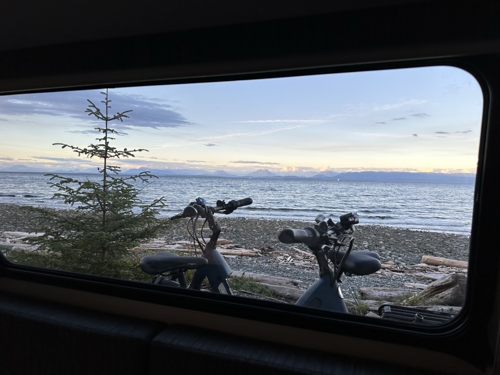 Now…it is time to move on – again! However, I need to cover off on a few incidents that happened to us during the camping months of June to September of 2023. Our first trip after returning to Vancouver Island from our maiden voyage (Osoyoos’ Nk’Mip campground) was to Quadra Island. This is accessible via a ferry from Campbell River, BC. Loading onto the ferry was a bit in question due to the low tide, but we easily cleared the deck of the ferry. We stayed at Taku Lodge campground for a couple days, and rode our e-bikes around Herriot Bay to the Provincial Park at Rebecca Spit to enjoy the sunshine and lovely beach area.