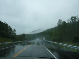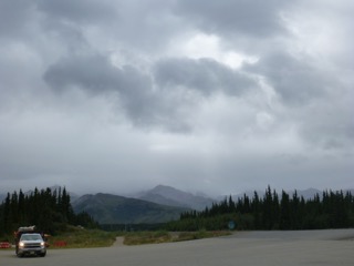 The rain that began there has followed us for two days (we stopped one night in Trapper Creek), and though we managed to outrun the edge of the large system by the time we got to the Visitor Center in Denali National Park, still we were in heavy weather prior to that, and hopes for seeing Mt. McKinley died. However, the rain stopped for our drive up to the end of the public access road in Denali, and the park was very beautiful. We also watched the movie in the Visitor Center, and saw most of what we could see yesterday.