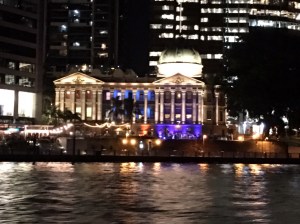 A historical building amidst the new towers – at night – from the river ferry